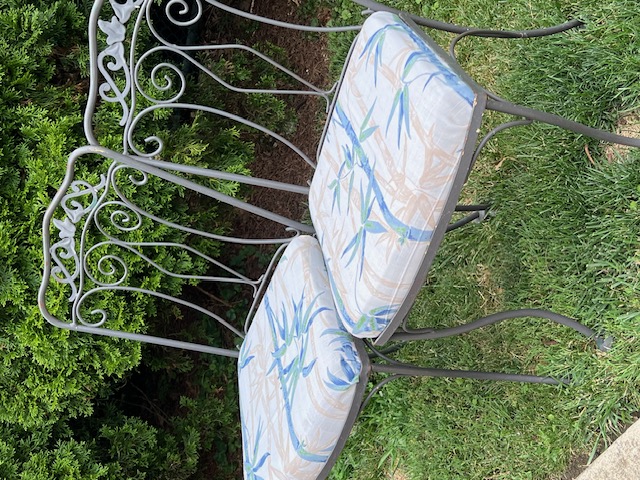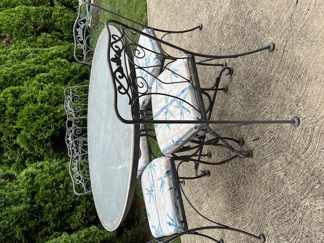 Vintage wrought iron patio table with six chairs. $125.00. In good condition except for scratches here and there. Could use a fresh coat of paint. Patrizia Costa Sent from my iPhone