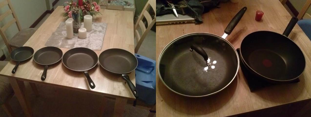 These TFAL pans are used but are still in good shape. There are minor nicks and scratches as to be expected. The TFAL pans include: 2 x 10" Skillet 1 x 8.5" Skillet 1 x 7" Skillet 1 x 11" Wok (stir-fry pan) The Calphalon pan is 12" and includes a glass cover. This pan is heavily scraped and scratched, bit it still works well as a sauce pan. You don't have to take it if you don't want it. Please reply via email if interested. Thanks! Jacob