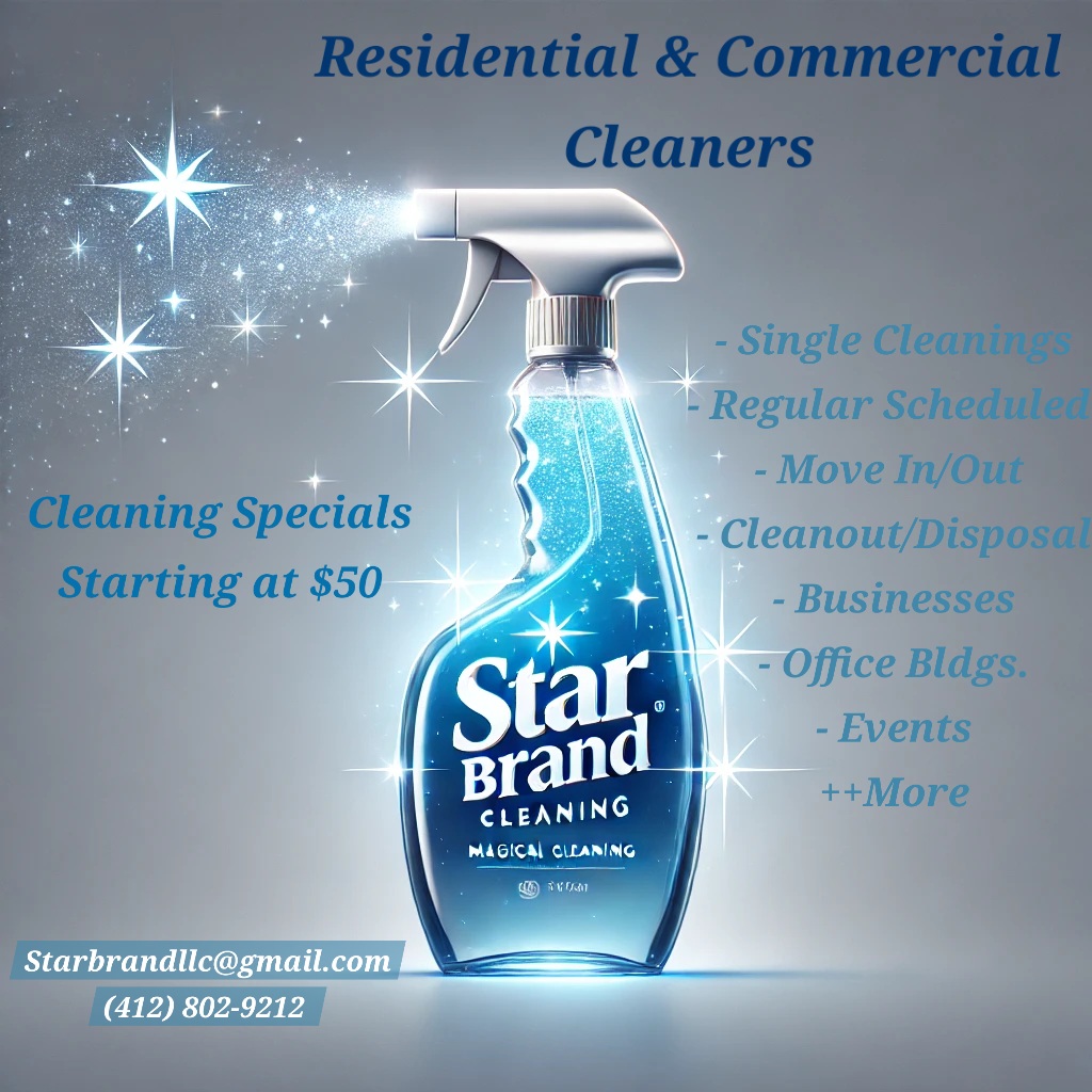 Cut Cost with Our Cleaners......Times are harder for everyone! Save right at home or within your small business with our cleaning services!! *Ask about our referral program, which includes a FREE cleaning! 🧽 1 bdrm = $50 🧽 2 bdrm = $125 🧽 3 bdrm = $175 🧽 4 bdrm = $200 🧽 5+ bdrm = $250+ *Additional fee for Deep Cleaning 💼 Call for a consultation or free quote!! 🌟Now offering patio clean-ups! 🍂 🧹Debris removal 💧Spray down the area 🪑Basic Furniture Cleaning/Wipe down 🗑Organizing Star Brand Cleaning (412) 802-9212 We offer professional residential, commercial, event, and small business cleaning services, ensuring every space we touch is left sparkling clean and refreshed. Whether it’s a cozy home, a bustling office, a special event, or a small business, we provide customized cleaning solutions that fit your needs and schedule. ✔ *Residential Cleaning* – A clean home is a happy home. We take care of dust, dirt, and mess, so you can enjoy a fresh and stress-free environment. ✔ *Commercial Cleaning* – Maintain a professional and sanitary workspace that enhances productivity and leaves a lasting impression on clients and employees. ✔ *Event Cleaning* – From pre-event prep to post-event cleanup, we handle the mess so you can focus on making memories. ✔ *Small Business Cleaning* – We help small businesses shine with affordable, high-quality cleaning solutions tailored to your specific needs. At Star Brand Cleaning, we use eco-friendly products, detail-oriented techniques, and reliable service to ensure 100% customer satisfaction. Let us take the cleaning off your to-do list so you can focus on what truly matters. Would you like to schedule a free consultation or a trial service? We’d love to show you the Star Brand Cleaning difference!