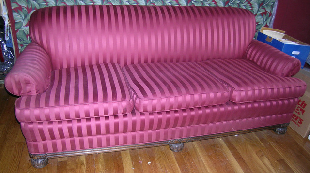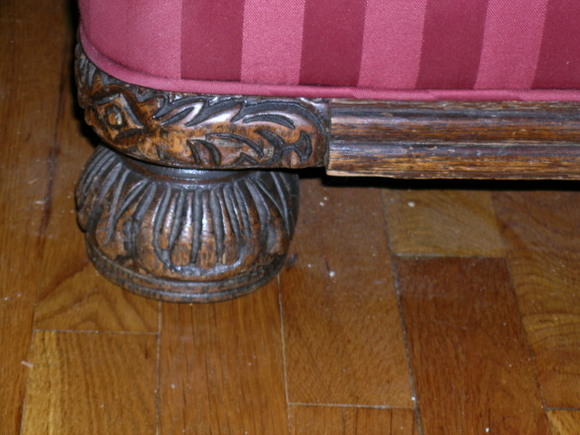 We are selling an antique sofa that belonged to my inlaws. We had it reupholstered in burgandy Robert Allen stripe on stripe fabric. The frame is carved solid oak and it is extremely heavy. In great condition. Asking $200. Marsha