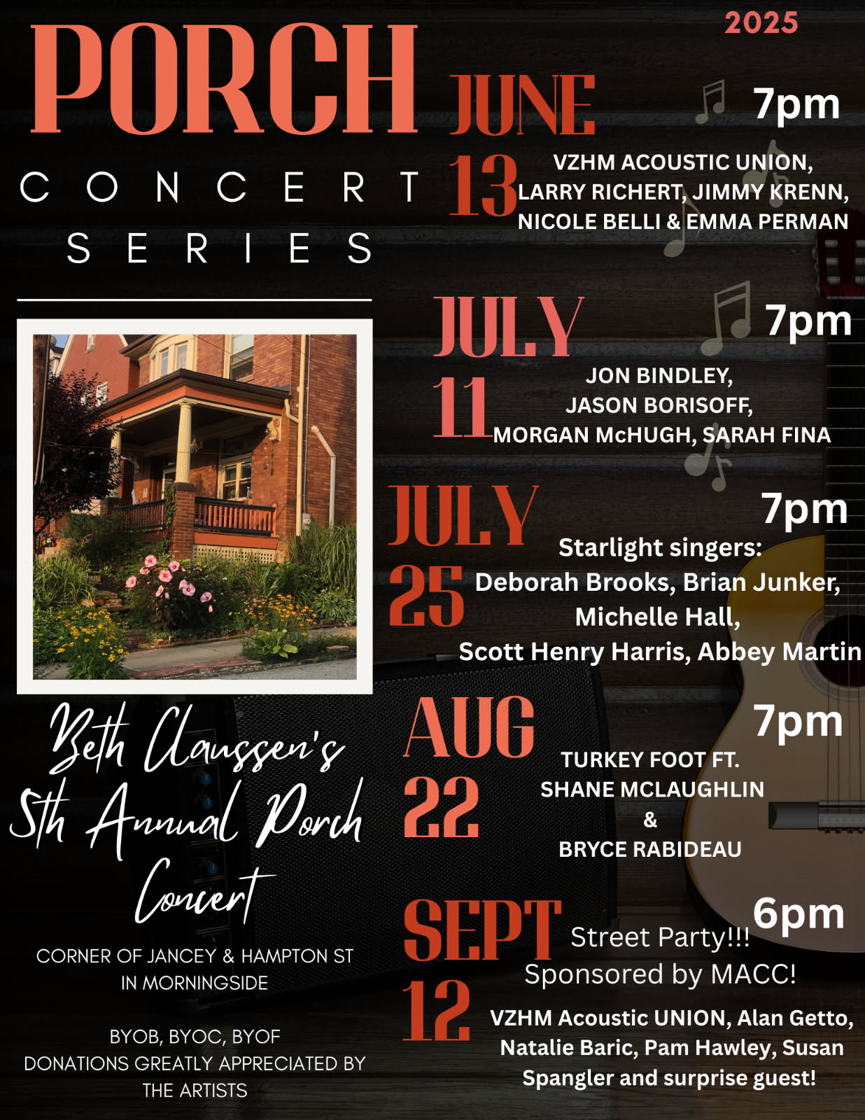 Hi friends! It’s porch concert season! I’m so excited to invite you to Morningside! Bring a chair, your favorite beverage and snack and join us this summer! All concerts are Friday evenings, and the line up of performers is absolutely AMAZING! Hope to see you! 5 years going strong! 🎶🎵🎸❤️🎉🥳 Sent from my iPad
