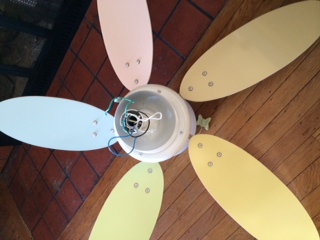 Hello Neighbors, We have a ceiling fan in excellent condition available for $75. The fan has a light with multiple fan speeds. The panels are white on one side and shades of pastels on the other. The pulls have butterfly's. Please contact if interested. Warmly, Tamara Sent from my iPhone