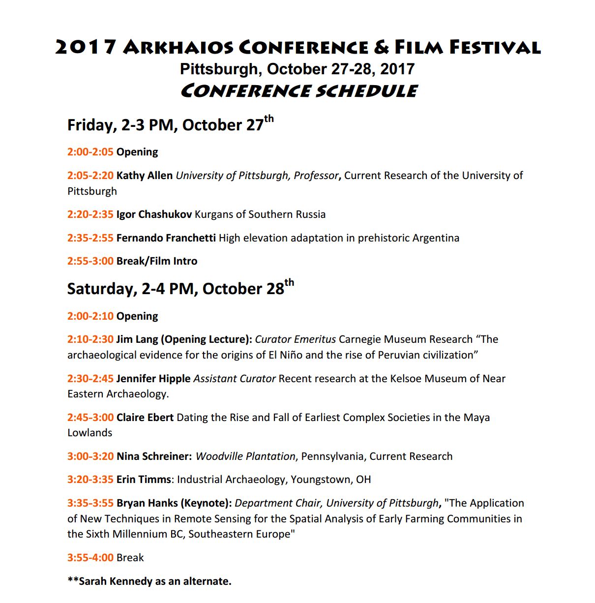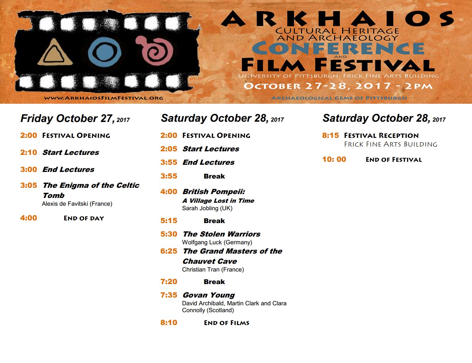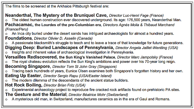 Dear Friends and Neighbors, I am pleased to announce the 3rd Annual Arkhaios Cultural Heritage and Archaeology Film Festival taking place this weekend November 2-3, 2019, at the Frick Fine Arts Building, Schenley Drive, Pittsburgh, PA. The festival will screen films Saturday November 2nd from 4:00pm to 8:00pm, and Sunday November 3rd from 1:30pm to 6:00pm. The event is free and open to the public.* 2 Days, 9 Films, 7 Countries and 8 Cultures ! * The films are scheduled as follows: More about the films are on the Arkhaios Facebook page, including synopsis and trailer for each film. https://www.facebook.com/pg/ArkhaiosFilmFestival/posts/ The Arkhaios Film Festival is sponsored in Pittsburgh by the University of Pittsburgh, Anthropology Department, and the Allegheny Chapter #1 of the Society for Pennsylvania Archaeology. We hope you will join us. Prepare to be amazed! Admission is free. Let me know if you have any questions, Jean F. Guilleux Neighbor and Arkhaios Founder