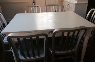 Nice white farm table with pull out drawer. Perfect size for an eat in kitchen! Seats 4-6 people. Since the table looks rather small in the picture, I have attached another showing you what my chairs looks like with six chairs. This is for the table only. Other items in picture not included. $250 or best offer. Cash only. Thanks for looking! Health and happiness, Angela