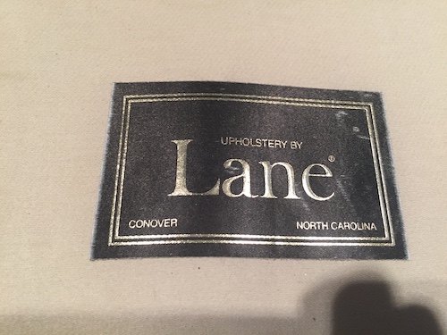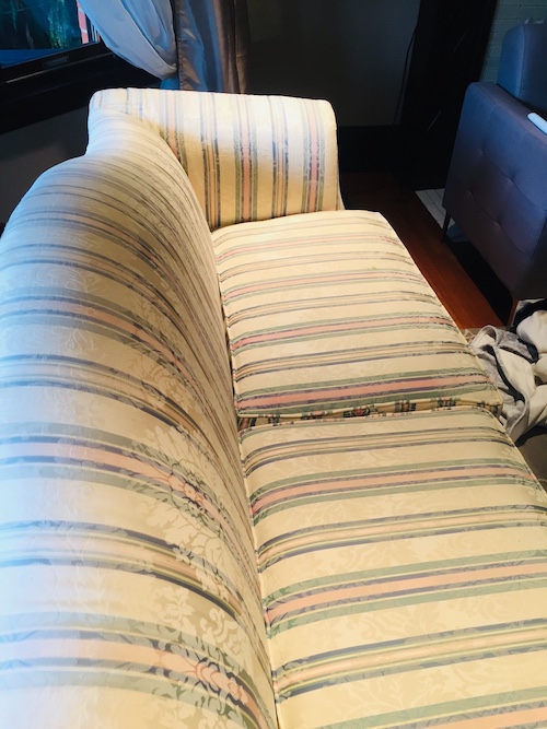 Sofa For Sale: Lane Furniture $300 OBO -- includes slip-cover in ivory as shown -- cherry cabriole legs -- two cushions, center leg support -- original upholstery in striped "mint meltaway" candy colors: yellow,green,pink,blue with a small tear and minor stains -- cash only please -- must take delivery from sidewalk to preserve the 6 foot distance restriction Thanks!