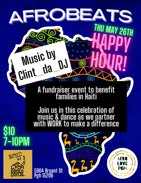 Join us this Thursday, May 26th 7-10pm for a celebration of African music & dance with Clint_da_DJ !! Afro Love Pgh is partnering with Clint_da_DJ to contribute towards our May team campaign "Run Across May" by WORK. WORK is an organization that accompanies families in Haiti out of poverty through good, dignified jobs. You can discover more about their work on here: www.dowork.org The event proceeds will go towards our campaign: https://charity.pledgeit.org/t/SZgzBnuZPf Come celebrate music & dance with us as we wrap up our month of giving. Cover: $10 Location: Casa Brasil 5904 Bryant St, Pittsburgh 15206 From 7-10pm Advance tickets: https://www.eventbrite.com/e/346230002257 There will still be class in Highland Park from 6-7pm right before the event. You can find details on here: https://fb.me/e/1pRBVPJ8e With gratitude <3