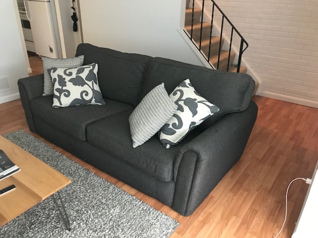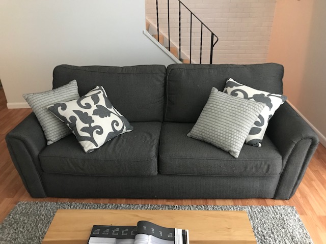 Still available: Grey sofa for sale - just a year and a half old. Doesn't fit through the door of my new place. Paid $799 at Levin, still in good condition. $350, or make an offer. Must Pick up. Needs gone ASAP!